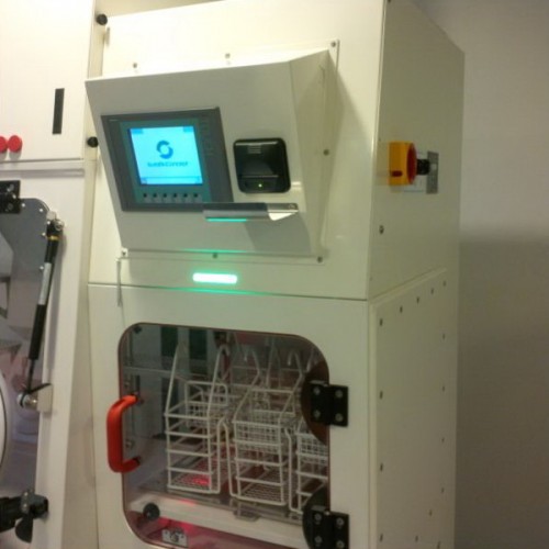 - Интегрированный газовый генератор: Два интегрированных H2O2 газовых генератора (один на каждую из камер для стерилизации). Испаритель закреплен непосредственно под каждой из камер для стерилизации. Накачивание H2O2 из резервуара выполняется при помощи перистальтического насоса. Испаритель контролируется при помощи HMI. Для поддержания цикла H2O2 на минимальном уровне цикл аэрации (он всегда самый длинный) имеет независимый выход в атмосферу из камеры для стерилизации и основной камеры. Для камеры для стерилизации “типичным” является достигнутый ранее цикл: время обработки газа - 15 минут, время аэрации - 15 минут. Газовая обработка H2O2 всей системы изолятора может проводиться на регулярной основе – к примеру, один раз в месяц для поддержания стерильности.